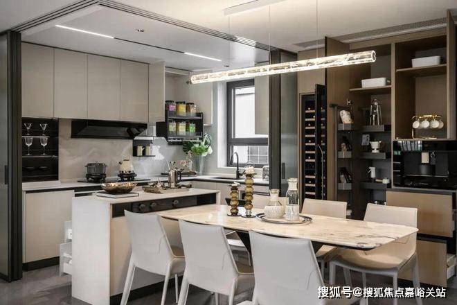 招商时代乐章艺术化的再造传统餐厨空间,可开可合的岛台设计,结合艺术玻璃移门,在提升空间灵动性的同时,也激发出餐厨空间生活的多样性。